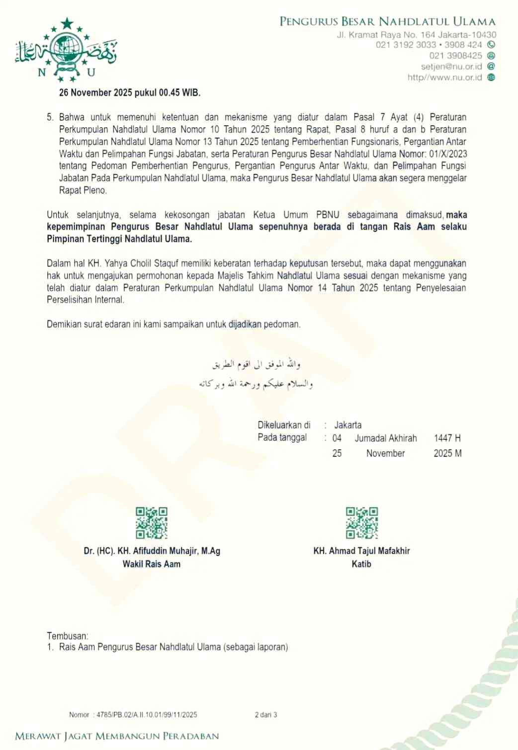 Selain pemberhentian, PBNU diminta segera menggelar rapat pleno untuk membahas penggantian fungsionaris sesuai aturan organisasi. Selama masa kekosongan jabatan, kepemimpinan PBNU berada sepenuhnya di bawah Rais Aam sebagai pucuk tertinggi Jam’iyyah.