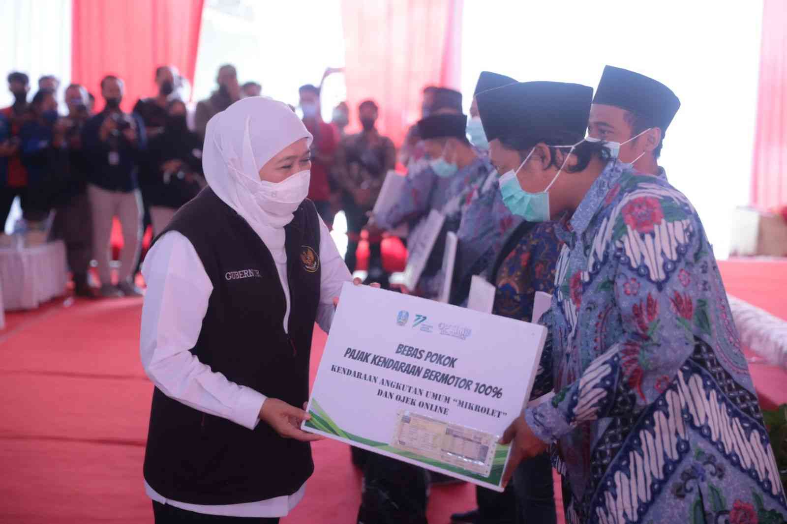 Gubernur Khofifah menyerahkan secara simbolis program Asistensi Sosial Penyandang Disabilitas (ASPD) kepada 5 orang, Pembebasan Pokok Pajak Kendaraan Bermotor (PKB) 100% untuk Pengemudi Mikrolet 5 orang dan ojek sebanyak 5 orang.