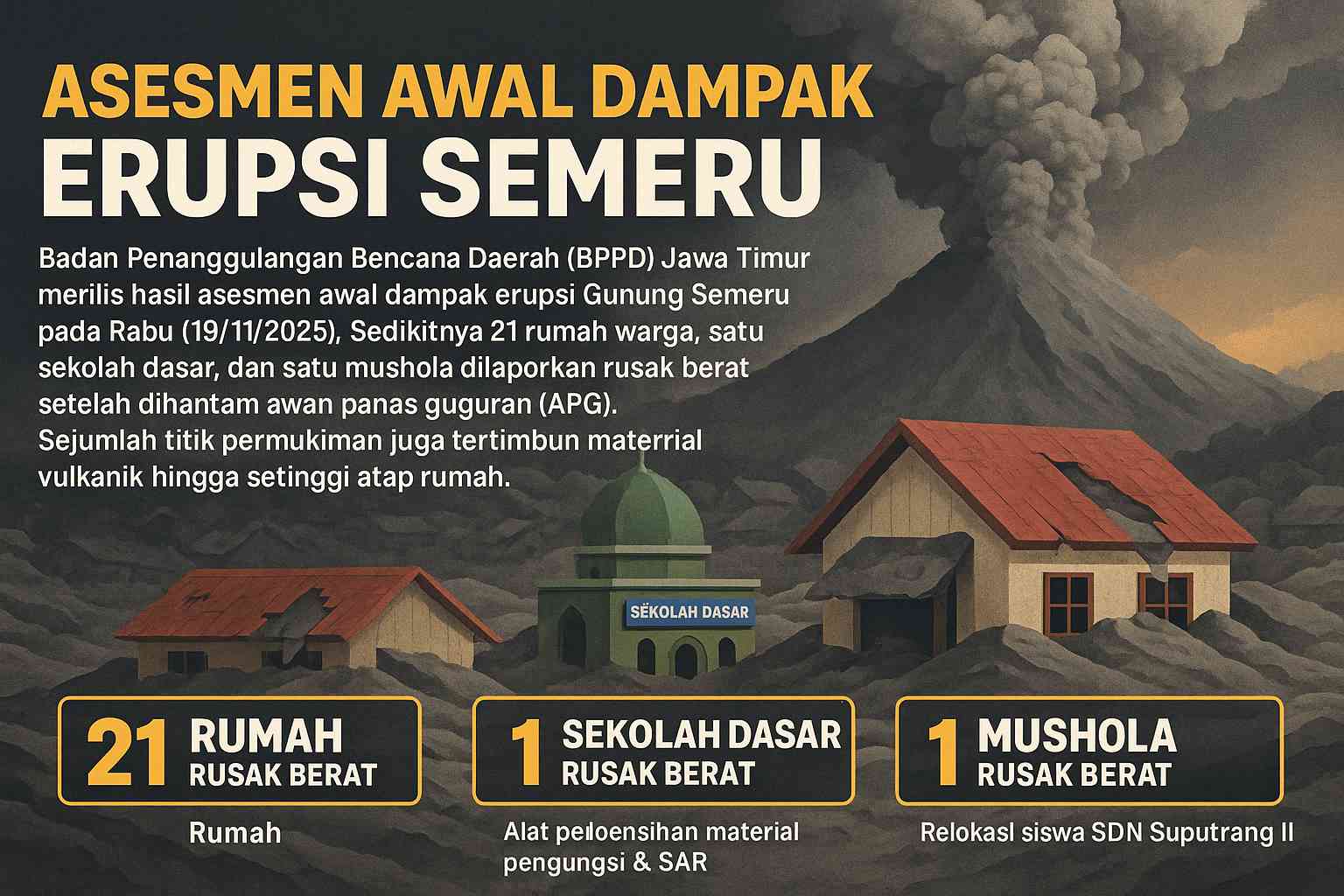 LUMAJANG, PustakaJC.co — Badan Penanggulangan Bencana Daerah (BPBD) Jawa Timur merilis hasil asesmen awal dampak erupsi Gunung Semeru pada Rabu (19/11/2025). Sedikitnya 21 rumah warga, satu sekolah dasar, dan satu mushola dilaporkan rusak berat setelah dihantam awan panas guguran (APG). Sejumlah titik permukiman juga tertimbun material vulkanik hingga setinggi atap rumah.