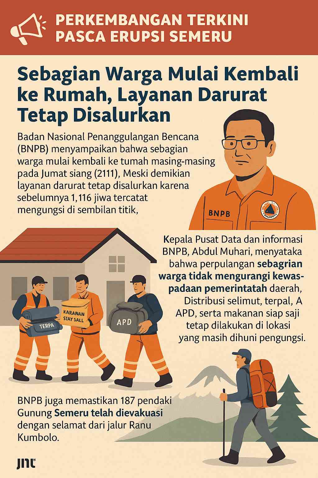 Kepala Pusat Data dan Informasi BNPB, Abdul Muhari, menyatakan bahwa perpulangan sebagian warga tidak mengurangi kewaspadaan pemerintah daerah. Distribusi selimut, terpal, APD, serta makanan siap saji tetap dilakukan di lokasi yang masih dihuni pengungsi.