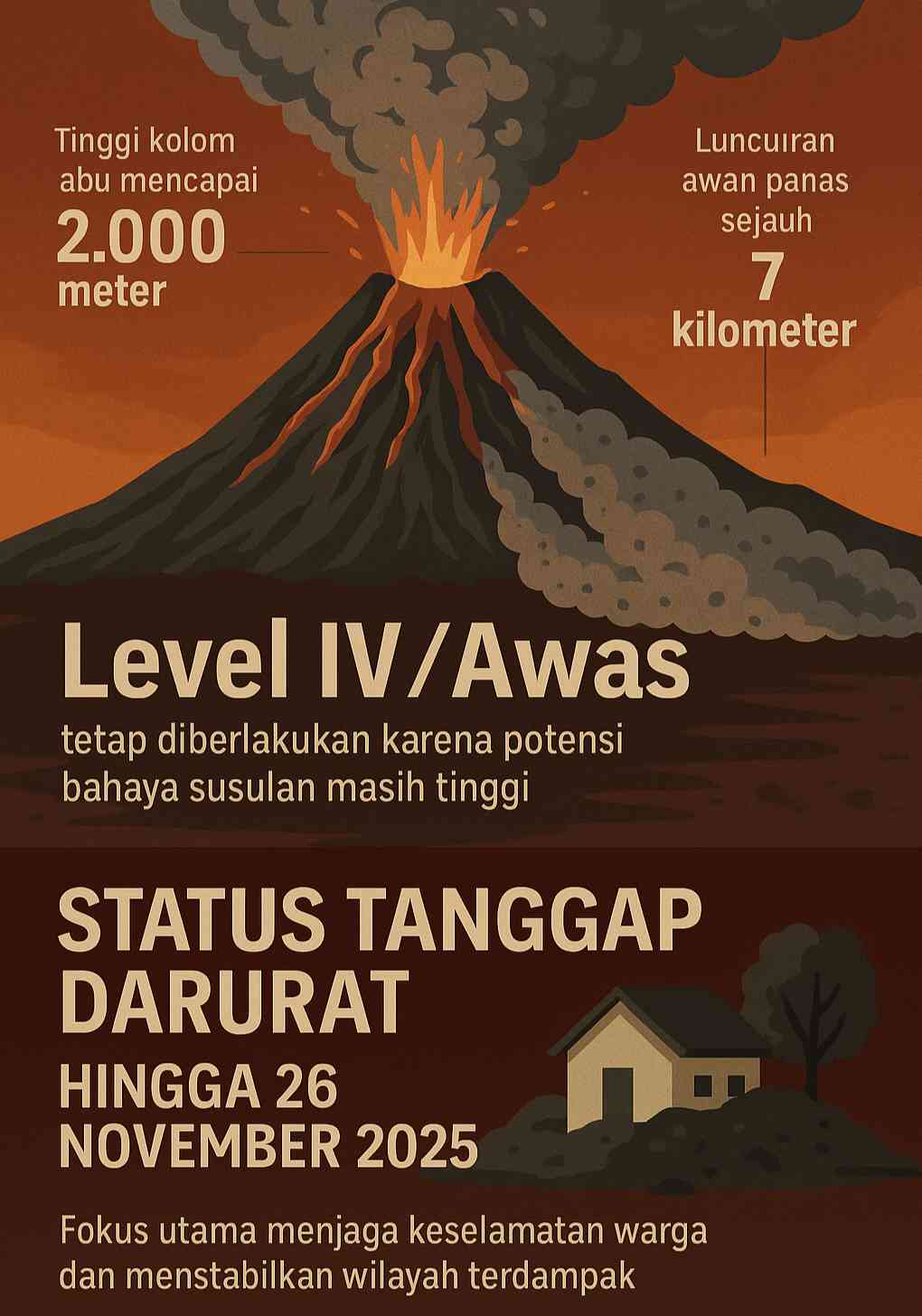 Badan Geologi ESDM melaporkan tinggi kolom abu mencapai 2.000 meter dengan luncuran awan panas sejauh 7 kilometer. Meskipun aktivitas erupsi berhenti pukul 18.11 WIB, Level IV/Awas tetap diberlakukan karena potensi bahaya susulan masih tinggi.