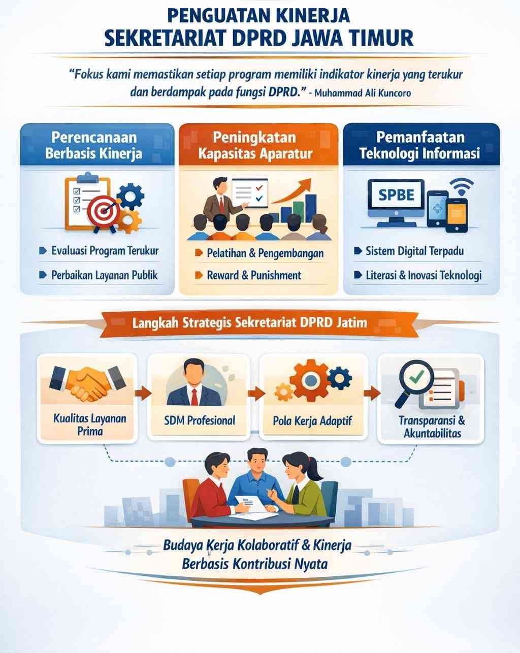 Selain itu, Sekretariat DPRD Jatim juga mendorong peningkatan profesionalisme aparatur melalui pelatihan teknis, penguatan literasi digital, serta penerapan pola kerja yang lebih adaptif dan transparan. Skema reward and punishment diterapkan secara terukur untuk meningkatkan kedisiplinan, etos kerja, dan kinerja aparatur.