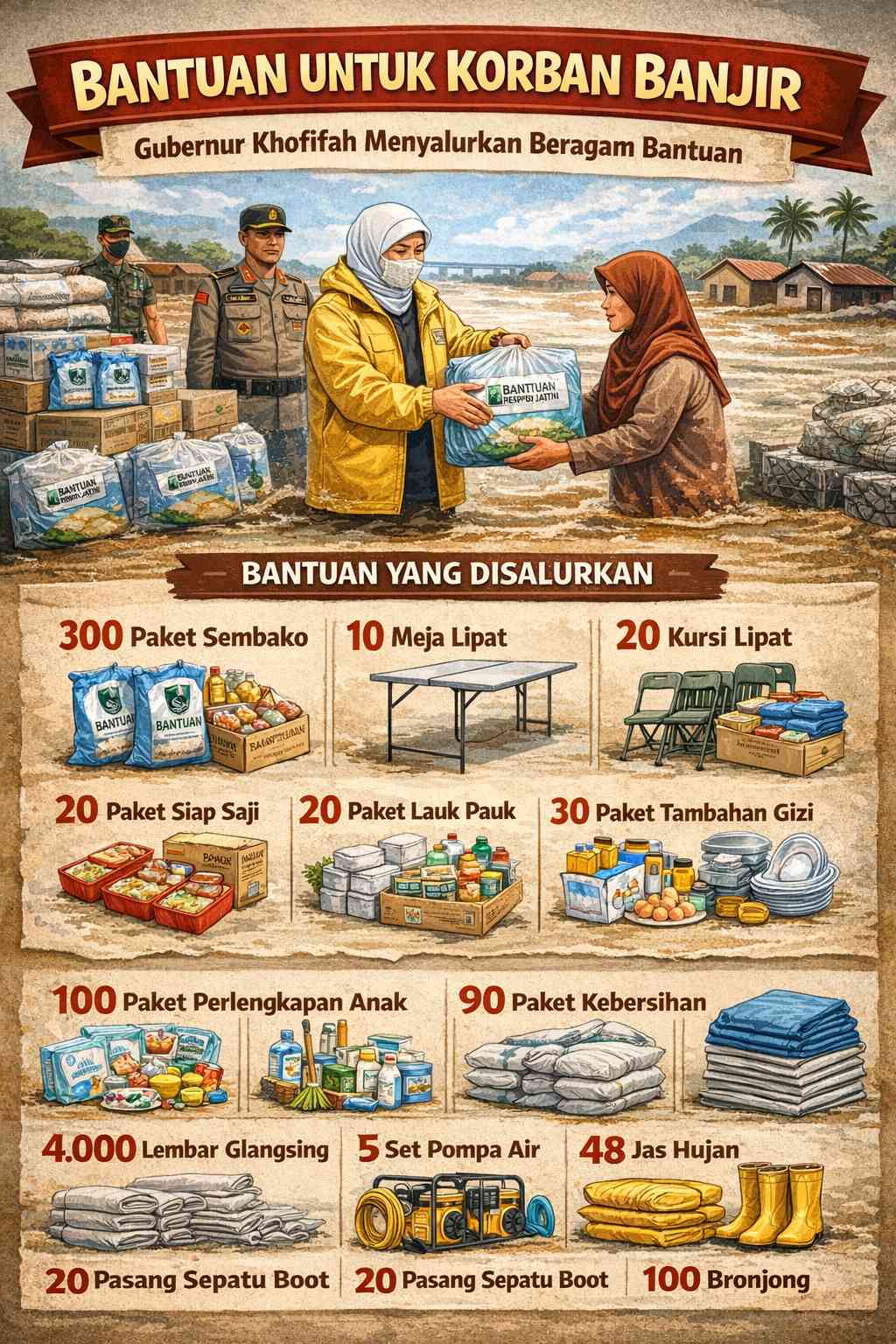 Dalam kunjungan tersebut, Gubernur Khofifah menyalurkan bantuan berupa 300 paket sembako, 10 meja lipat, 20 kursi lipat, 20 paket siap saji, 20 paket lauk pauk, 30 paket tambahan gizi, serta 285 paket perlengkapan makan.