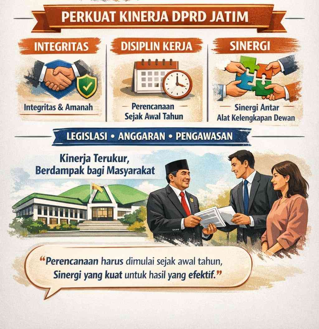 Menatap 2026, DPRD Provinsi Jawa Timur menargetkan kinerja kelembagaan yang semakin responsif, produktif, dan berorientasi pada kepentingan masyarakat. Prioritas utama adalah memastikan seluruh tugas dan fungsi DPRD dijalankan sesuai dengan ketentuan peraturan perundang-undangan.