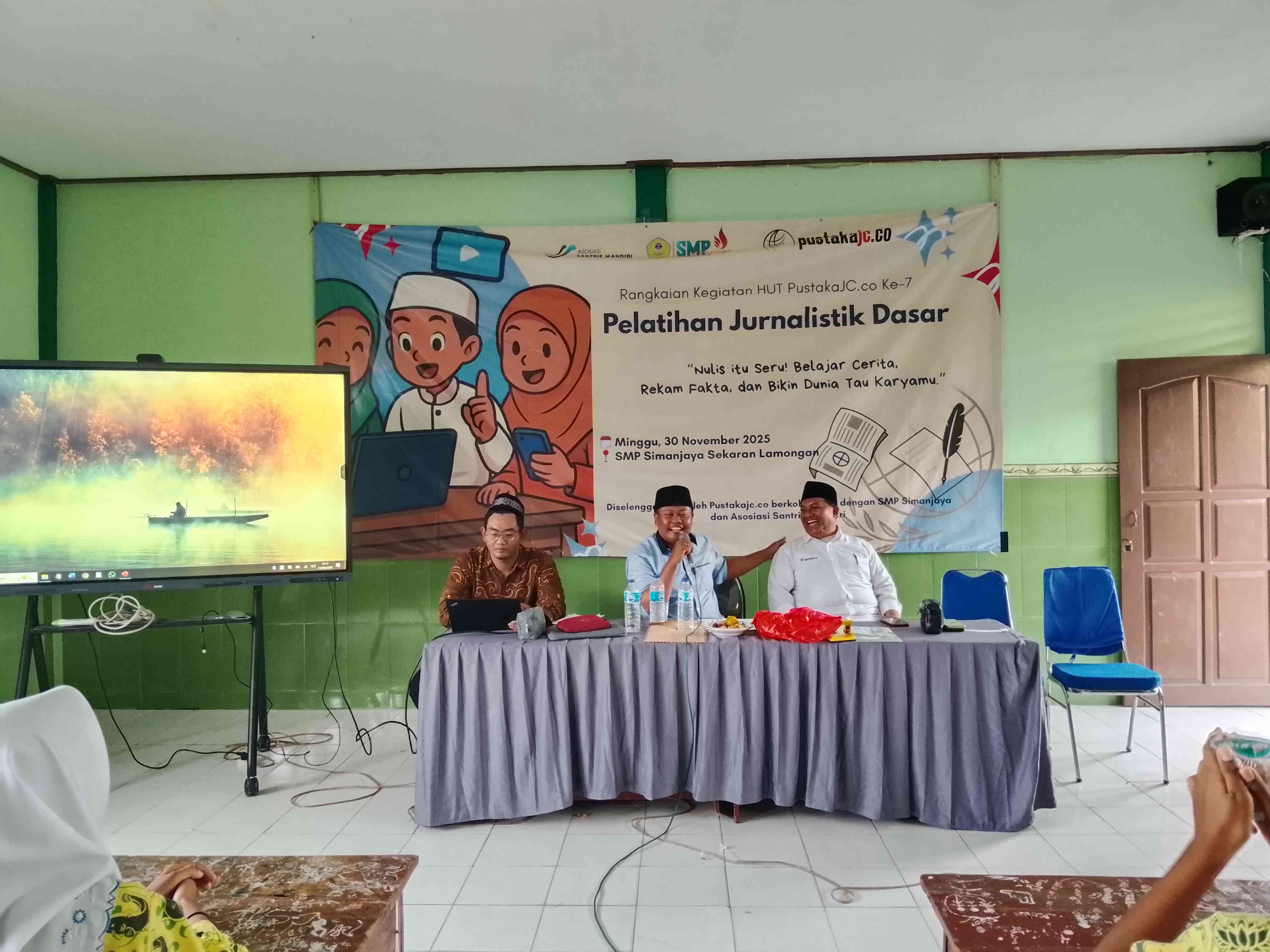 LAMONGAN, PustakaJC.co – Suasana antusias tampak memenuhi aula SMP Simanjaya Sekaran Lamongan pada Minggu, 30 November 2025. Para siswa berkumpul rapi mengikuti Pelatihan Jurnalistik Dasar, salah satu rangkaian acara HUT ke-7 PustakaJC.co yang digelar bekerja sama dengan Asosiasi Santrie Mandiri. Momentum ini tak hanya menjadi perayaan, tetapi juga ruang bagi siswa untuk belajar langsung dari praktisi media digital.